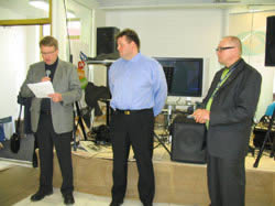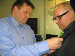 Mikkelin Insinöörien puheenjohtaja Arto Puumalainen, Savonlinnan Insinöörien puheenjohtaja Janne Reijonen, Pieksämäen Seudun Insinöörien puheenjohtaja Matti Häkkinen ja Insinööriliiton asimies Eero Seppälä olivat tänään luovuttamassa maakuntahallituksen puheenjohtajalle Markku Kakriaiselle Insinööriammattikunnan Kultaista Insinöörimerkkiä.
